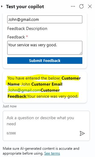- Run a flow from copilot: Created three input parameters: customer name, customer email, and customer feedback.