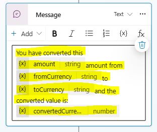 Then, pass the from currency to currency and amount parameters from the adaptive card output.