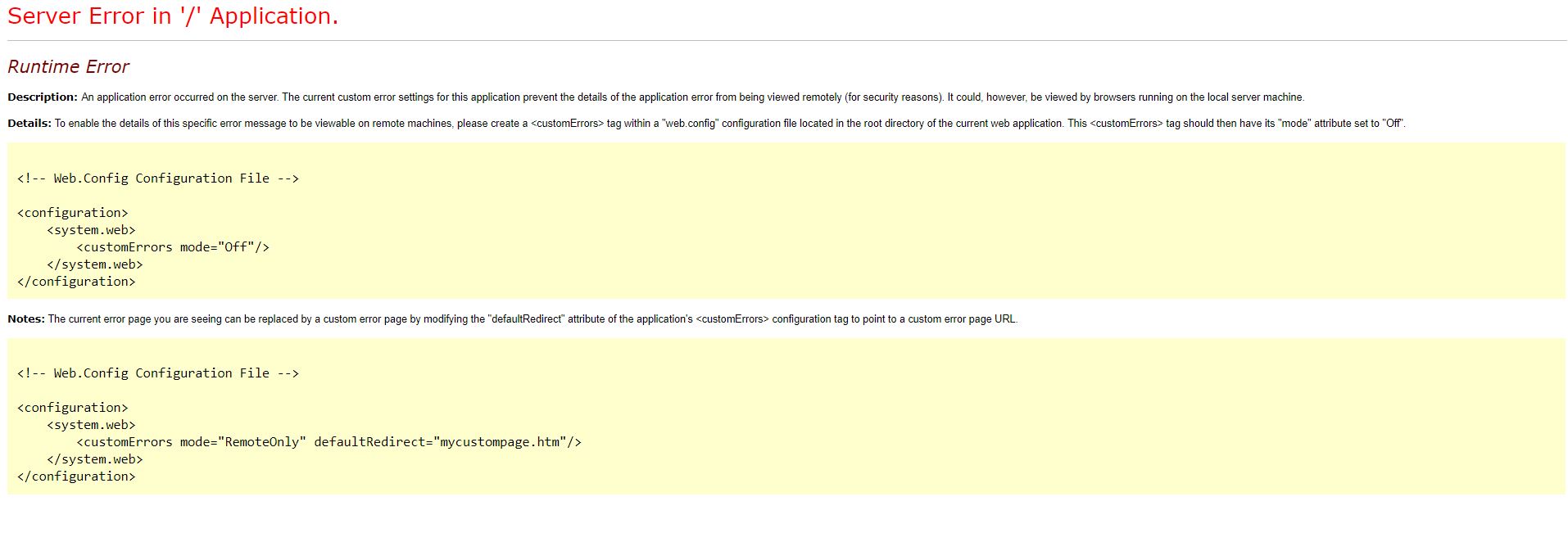 Server Error in '/' Application. Runtime Error Description: An application error occurred on the server. The current custom error settings for this application prevent the details of the application error from being viewed remotely (for security reasons). It could, however, be viewed by browsers running on the local server machine. Details: To enable the details of this specific error message to be viewable on remote machines, please create a <customErrors> tag within a "web.config" configuration file located in the root directory of the current web application. This <customErrors> tag should then have its "mode" attribute set to "Off". <!-- Web.Config Configuration File --> <configuration> <system.web> <customErrors mode="Off"/> </system.web> </configuration>