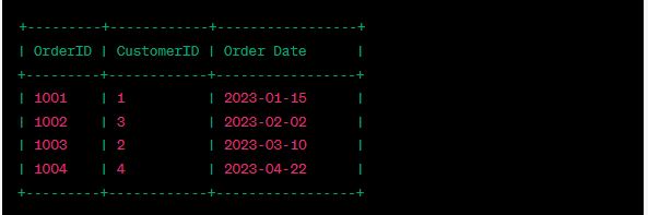 Suppose we want to retrieve the orders made by customers whose names start with the letter ‘J‘. We can use a subquery in the WHERE clause to accomplish this: