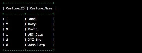 Suppose we want to retrieve a list of all customers and suppliers together, including duplicate rows. We can use the UNION ALL operator to combine the results of two SELECT statements:
